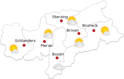 In den zentralen Gebirgsgruppen von Ulten über das Sarntal bis zu den Stubaier- und Zillertaler Alpen sorgen tiefe Wolken meist für trübe Verhältnisse, vereinzelt können auch ein paar Schneeflocken fallen. Auf den Bergen im Vinschgau bzw. Richtung Sextner Dolomiten verläuft der Tag dagegen oft sonnig.